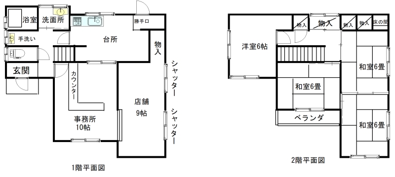 | 間取内訳 | 1F店舗9、事務スペース10、キッチン6 2F和室6×3、洋6 | ||